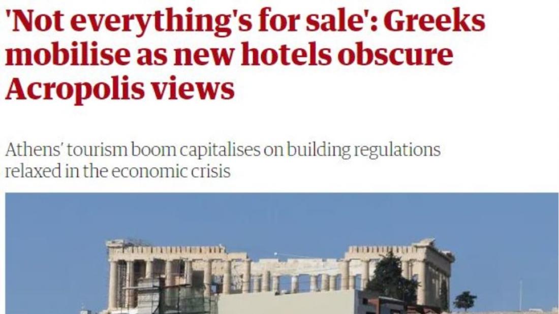 Και η Guardian ασχολήθηκε με το σάλο που έχει ξεσπάσει το τελευταίο διάστημα με αφορμή το 10όροφο ξενοδοχείο που χτίζεται στην οδό Φαλήρου και απειλεί να κρύψει την θέα στην Ακρόπολη.