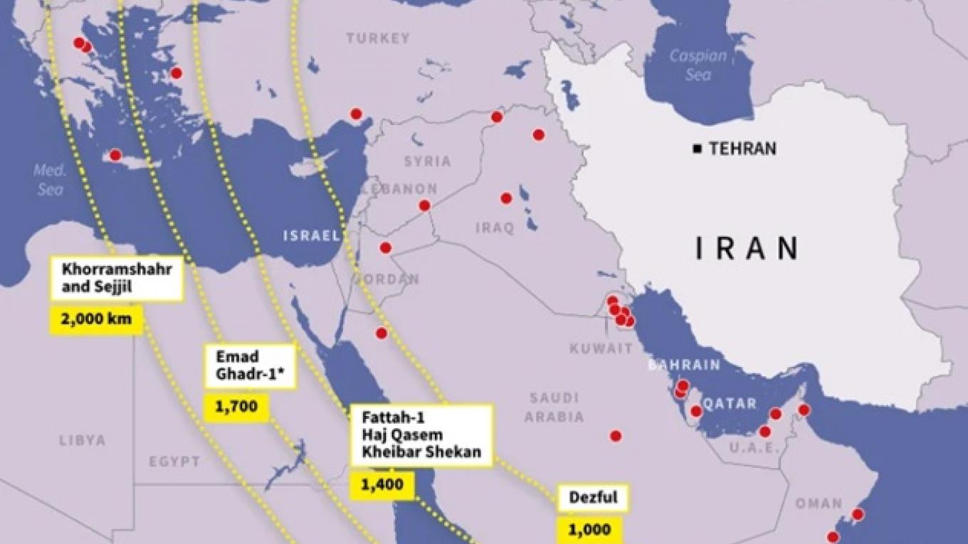 Χάρτη–ινφογραφικό που παρουσιάζει τη γεωγραφική κατανομή μεγάλων αμερικανικών στρατιωτικών βάσεων στη Μέση Ανατολή και την εμβέλειά τους σε σχέση με τους βαλλιστικούς πυραύλους μέσου βεληνεκούς του Ιράν δημοσίευσε το Γαλλικό Πρακτορείο Ειδήσεων (AFP).