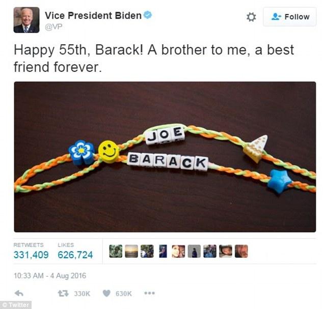 Λίγους μήνες νωρίτερα και συγκεκριμένα στις 4 Αυγούστου ο Μπάιντεν είχε ευχηθεί με ένα tweet στο Αμερικανό πρόεδρο για τα 55α γενέθλιά του, κάνοντας λόγο για "αδελφό" και "καλύτερο φίλο για πάντα" , ανεβάζοντας μια φωτογραφία με το βραχιόλι της φιλίας.