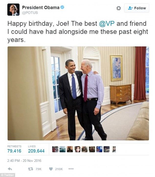 "Χρόνια Πολλά Τζο. Ο καλύτερος αντιπρόεδρος και φίλος που θα μπορούσα να έχω δίπλα μου αυτά τα οκτώ χρόνια", έγραψε ο Ομπάμα