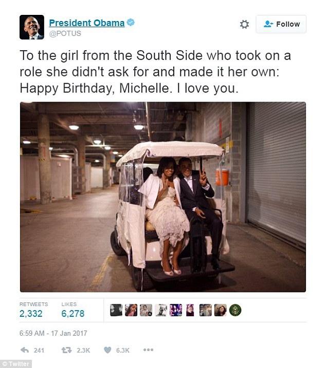 "Στο κορίτσι από το Νότο, που ανέλαβε έναν ρόλο, τον οποίο ήθελε και τον έκανε δικό του. Χρόνια Πολλά Μισέλ. Σ'αγαπώ", έγραψε ο Ομπάμα στο tweet του, ανεβάζοντας και μια φωτογραφιά τους σε αμαξάκι του γκολφ να πηγαίνουν στον χορό μετά την ορκωμοσία στις 20 Ιανουαρίου 2009.