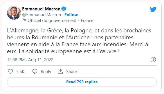 «Η Γερμανία, η Ελλάδα, η Πολωνία και, μέσα στις επόμενες ώρες, η Ρουμανία και η Αυστρία: οι εταίροι μας βοηθούν τη Γαλλία να αντιμετωπίσει τις πυρκαγιές », έγραψε στο Twitter ο Εμανουέλ Μακρόν. «Τους ευχαριστώ. Η ευρωπαϊκή αλληλεγγύη επί το έργον! », πρόσθεσε.