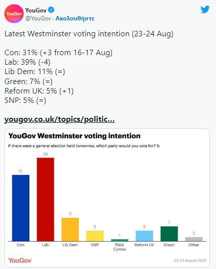 Η Λιζ Τρας, η τρίτη γυναίκα που αναλαμβάνει την πρωθυπουργία του Ηνωμένου Βασιλείου, αναδείχτηκε με το μικρότερο περιθώριο νίκης από τότε που τα μέλη των Τόρις άρχισαν να επιλέγουν τους ηγέτες τους. Ο Μπόρις Τζόνσον είχε πάρει το 66,4% των ψήφων το 2019, ο Ντέιβιντ Κάμερον το 67,6% το 2005 και ο Ιάν Ντάνκαν Σμιθ το 60,7% το 2001.
