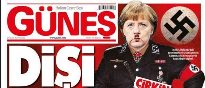 «Χίτλερ στο γυναικείο», είναι ο τίλος της εφημερίδας Günes με έναν αγκυλωτό σταυρό, τη φράση #FrauHitler αλλά και με τη σημείωση «η άσχημη Θεία» στο φωτομοντάζ της Άγγελα Μέρκελ το οποίο καταλαμβάνει τα τρία τέταρτα της πρώτης σελίδας της εφημερίδας.