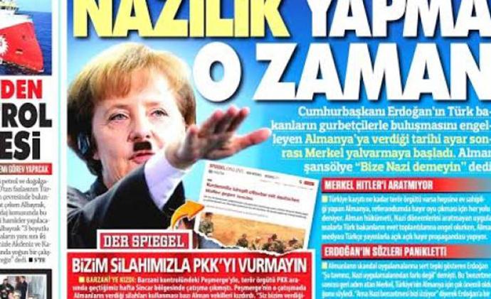 Η Άγγελα Μέρκελ με μουστάκι και στολή ναζί: μια τουρκική φιλοκυβερνητική εφημερίδα δημοσίευσε σήμερα στην πρώτη της σελίδα ένα φωτομοντάζ που δείχνει τη γερμανίδα καγκελάριο σαν Χίτλερ, εν μέσω κρίσης ανάμεσα στην Άγκυρα και στην ΕΕ.