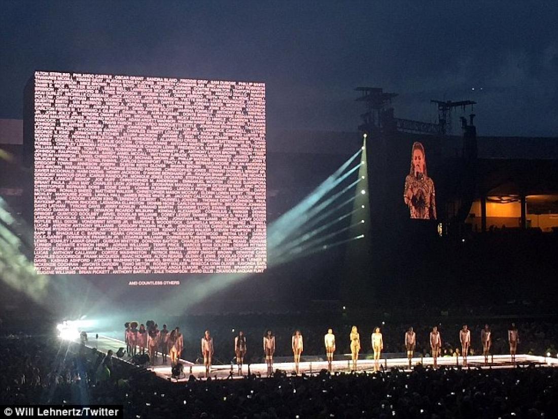 Ενώ η Μπιγιονσέ βρισκόταν στη σκηνή, τα ονόματα όσων έχουν πέσει θύματα αστυνομικής βίας στις ΗΠΑ εμφανίστηκαν πίσω της γραμμένα με ροζ χρώμα.