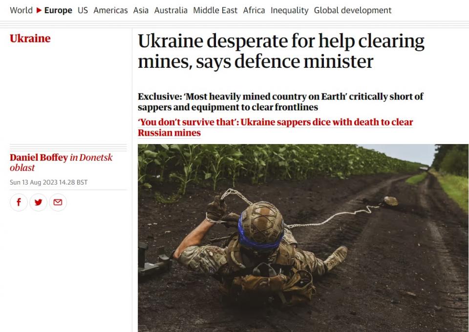 Προχθές Σάββατο ο πρόεδρος Βολοντίμιρ Ζελένσκι τόνιζε πως η Ουκρανία χρειάζεται διεθνή βοήθεια στην άρση ναρκοπεδίων. Λόγω των ναρκοπεδίων και των εκρηκτικών που δεν έχουν εκραγεί το τρέχον διάστημα 174.000 τετραγωνικά χιλιόμετρα είναι επικίνδυνα για τους πολίτες, τόνισε.