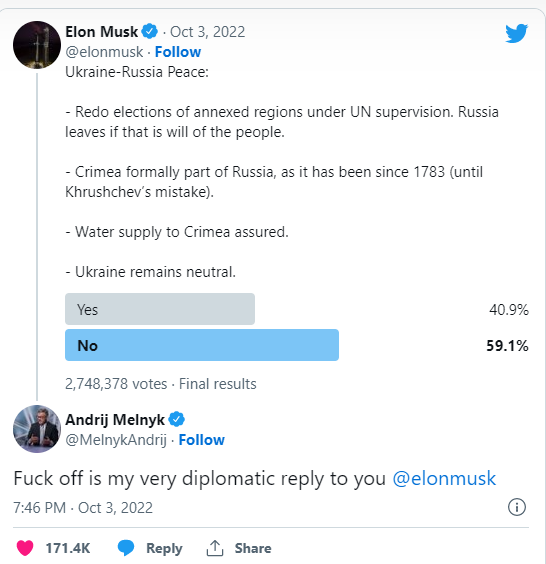 Ο αμερικανός δισεκατομμυριούχος Ίλον Μασκ ανακοίνωσε την απόφασή του να μην παρέχει στο εξής στην Ουκρανία δωρεάν το σύστημα δορυφορικού διαδικτύου Starlink και ζήτησε από το υπουργείο Άμυνας των ΗΠΑ να καλύψει το κόστος. Σύμφωνα με τον επιχειρηματία, η διακοπή της δωρεάν παροχής οφείλεται… στην αγένεια του ουκρανού πρέσβη στο Βερολίνο.