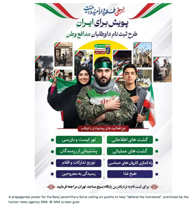 Σύμφωνα με δημοσιεύματα και καταγγελίες διεθνών οργανώσεων, η παραστρατιωτική οργάνωση Μπασίτζ και οι Φρουροί της Επανάστασης (IRGC) καλούν εφήβους και παιδιά να αναλάβουν ρόλους που κυμαίνονται από τη διοικητική μέριμνα έως τις περιπολίες και τον έλεγχο σημείων ασφαλείας.
