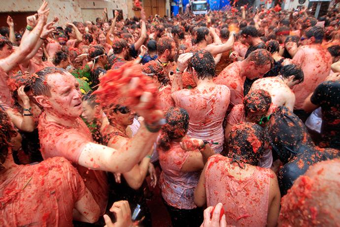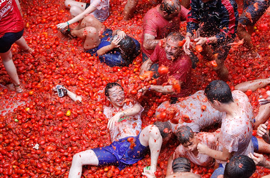 Η "Τοματίνα", που διεκδικεί τον τίτλο της "μεγαλύτερης μάχης με τρόφιμα στον κόσμο" έκλεισε φέτος τα 72 της χρόνια. Οι "μαχητές", ντυμένοι στη μεγάλη πλειονότητά τους με ένα απλό μαγιό και με γυαλιά κολύμβησης, γλέντησαν μέχρι που καλύφθηκαν στο τέλος από ένα παχύ στρώμα κόκκινου πολτού.