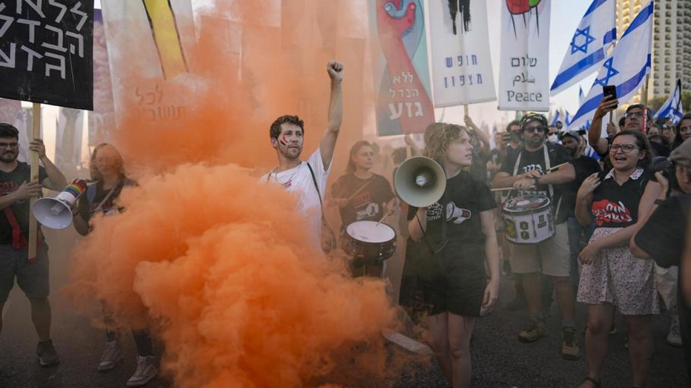 «Δημοκρατία! Δημοκρατία!» φώναζαν οι συγκεντρωμένοι, που κρατούσαν ισραηλινές σημαίες, σύμφωνα με δημοσιογράφους του Γαλλικού Πρακτορείου.