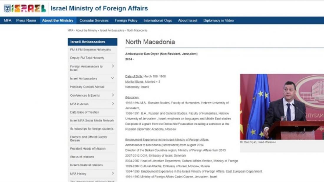 Συγκεκριμένα, στην επίσημη ιστοσελίδα του ισραηλινού ΥΠΕΞ, όπου παρουσιάζονται τα βιογραφικά του νυν και των πρώην Ισραηλινών πρεσβευτών στα Σκόπια, η ονομασία της χώρας είναι πλέον «North Macedonia» από «Macedonia» και η χώρα έχει καταχωρηθεί στο γράμμα «Ν».