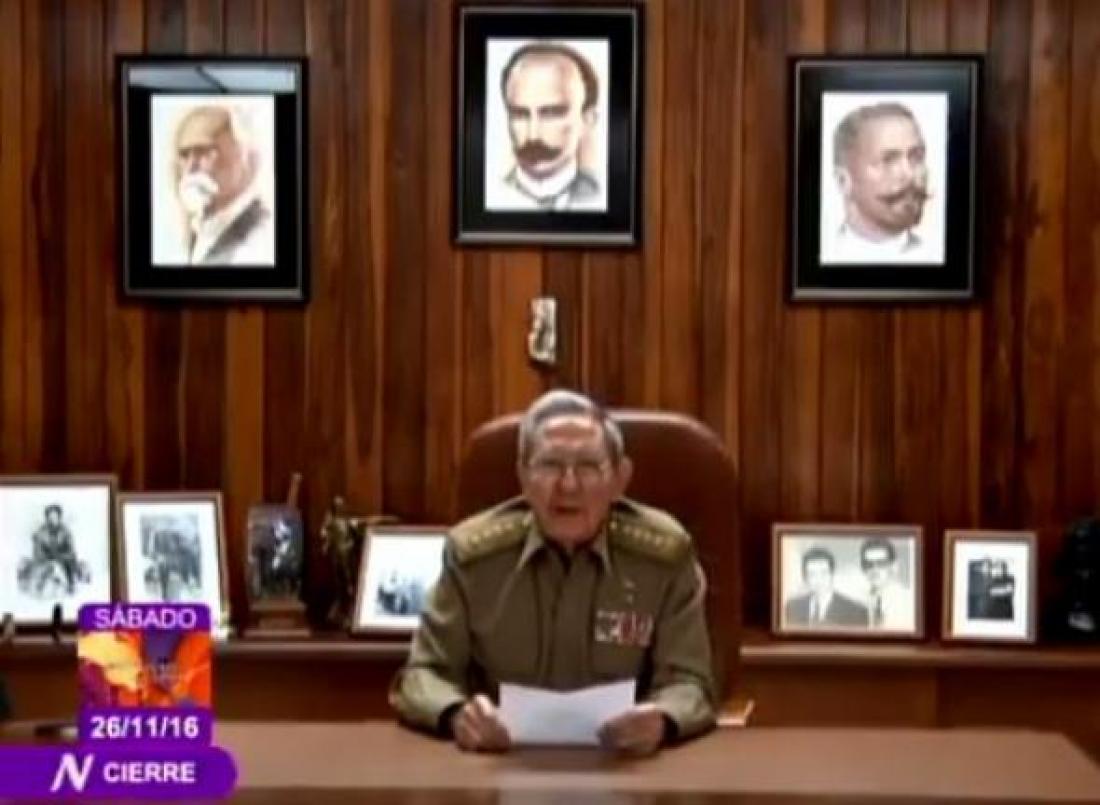 Καθισμένος στο γραφείο του, ο Ραούλ Κάστρο με διάγγελμά του ανακοίνωσε στον λαό της Κούβας, και τον υπόλοιπο πλανήτη, ότι ο ιστορικός ηγέτης «έφυγε» από τη ζωή. Ο Φιντέλ Κάστρο θα αποτεφρωθεί σήμερα, Σάββατο, «σύμφωνα με την εκπεφρασμένη βούλησή του», ανέφερε ακόμη ο Ραούλ Κάστρο, που ολοκλήρωσε το διάγγελμά του με τη δράση «Hasta la victoria siempre».