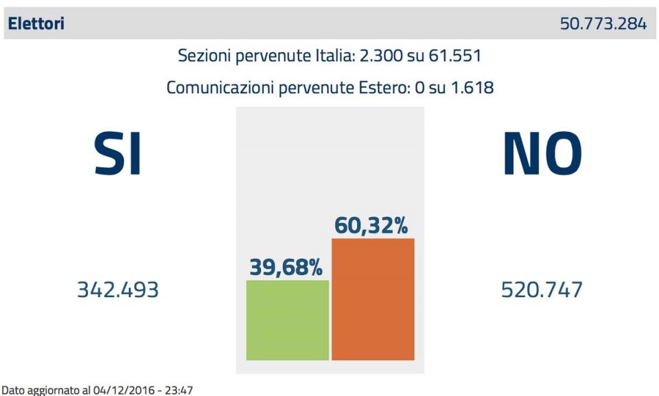 Η πρώτη προβολή της δημοσκοπικής εταιρίας Emg Acqua, επί δείγματος πραγματικών ψήφων, δίνει ποσοστό 59,2% στο «όχι» και 40,8% στο «όχι», όπως μετέδωσε το ιταλικό ιδιωτικό τηλεοπτικό κανάλι La 7.