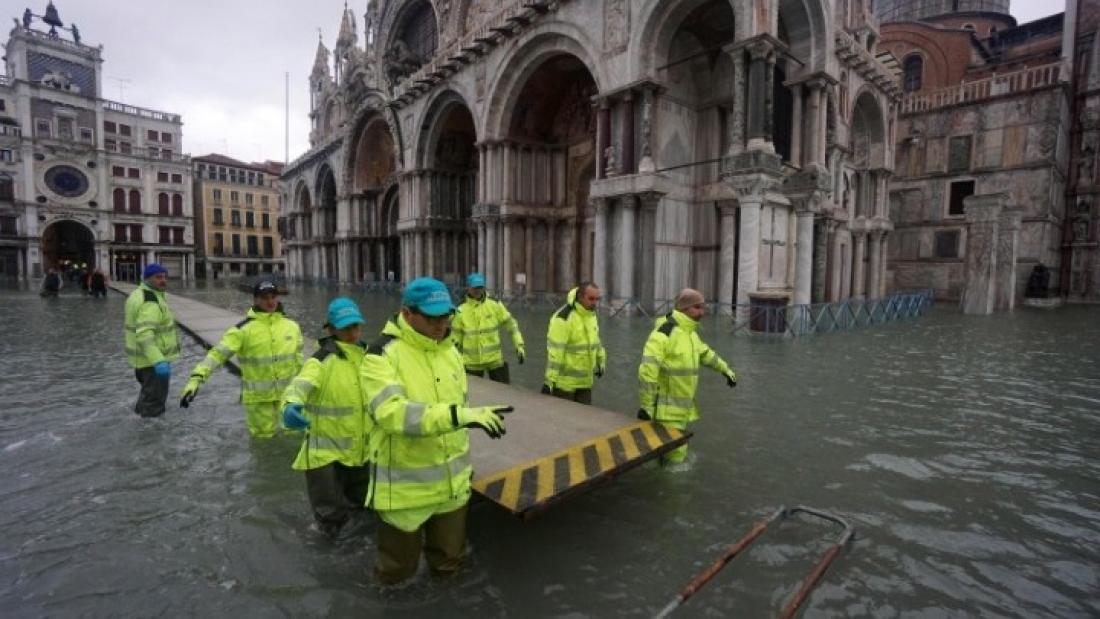 Στα πλάνα που μεταδίδουν τα τηλεοπτικά δίκτυα διακρίνονται άνθρωποι στη διάσημη πλατεία του Αγίου Μάρκου, να περπατούν με το νερό πάνω από το γόνατό τους.