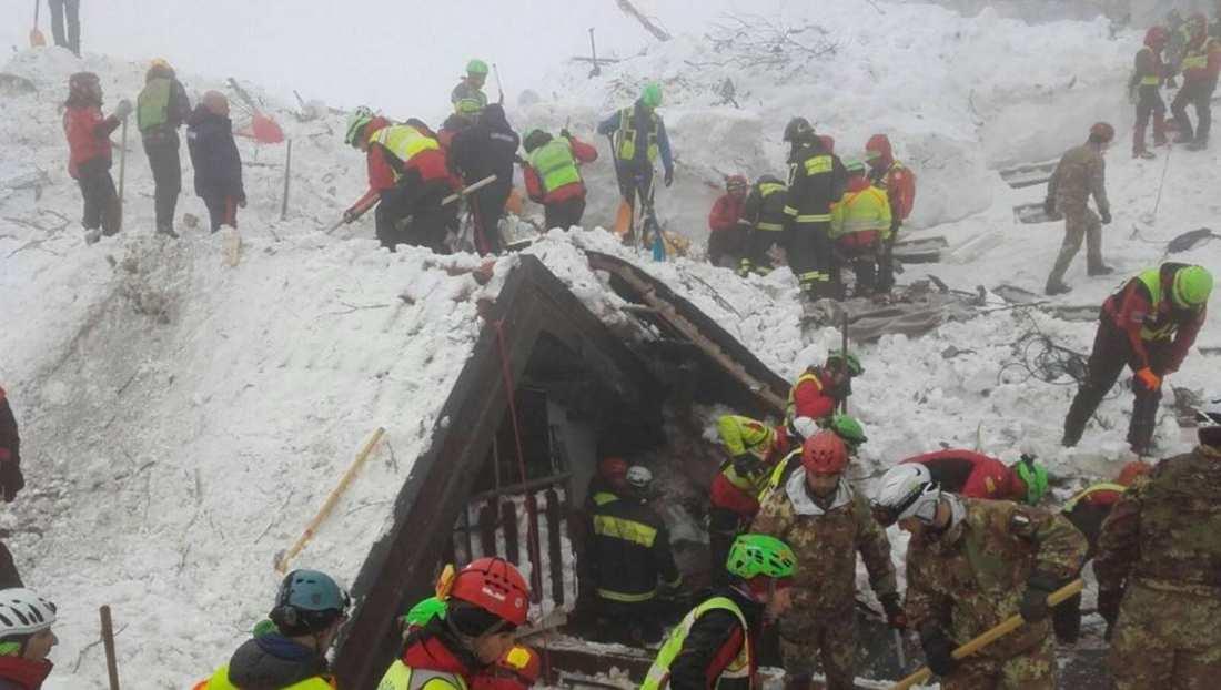 Συνεχίζονται οι προσπάθειες εντοπισμού τυχόν επιζώντων στο ξενοδοχείο Rigopiano της περιφέρειας Αμπρούτσο. Οι ελπίδες, πέντε ημέρες μετά τη χιονοστιβάδα που καταπλάκωσε το ξενοδοχείο, έχουν μειωθεί στο ελάχιστο, αλλά τα μέλη των σωστικών συνεργείων συνεχίζουν ακούραστα το έργο τους. Ο μέχρι τώρα απολογισμός είναι 6 επιβεβαιωμένοι νεκροί, 23 αγνοούμενοι 11 επιζώντες.