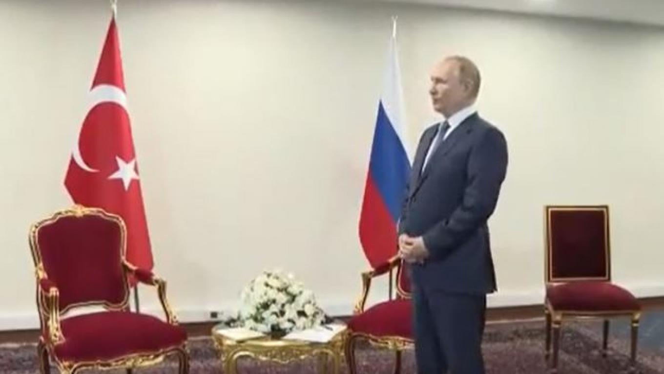 Στο βίντεο που κυκλοφόρησε από την τουρκική προεδρία φαίνεται ο Πούτιν να στέκεται μπροστά στην καρέκλα του και τις δύο σημαίες των χωρών, με τα χέρια σταυρωμένα, το στόμα του να συσπάται.