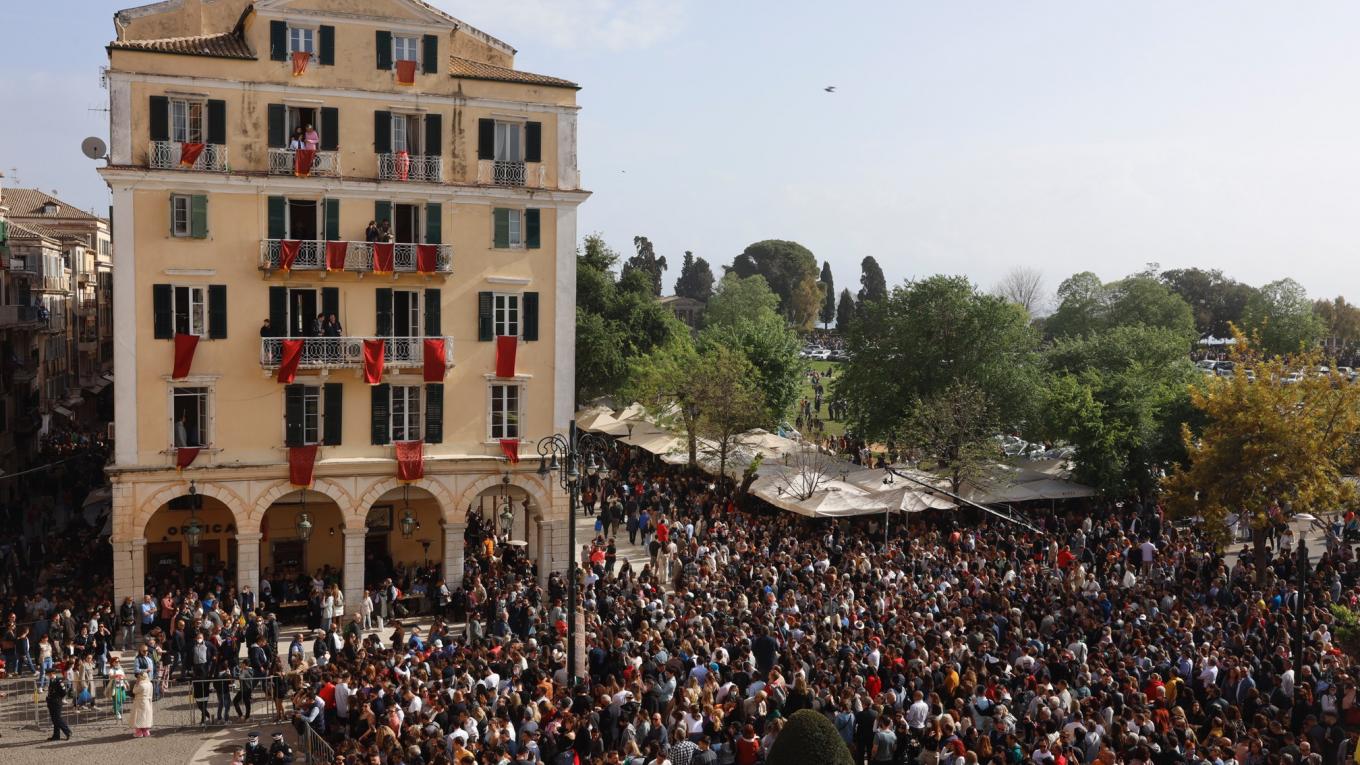 Με χιλιάδες επισκέπτες και ντόπιους να έχουν κατακλύσει την πλατεία και τα καντούνια στην Κέρκυρα πραγματοποιήθηκε στις 11:00 το πρωί το παραδοσιακό έθιμο του νησιού, η πρώτη Ανάσταση.