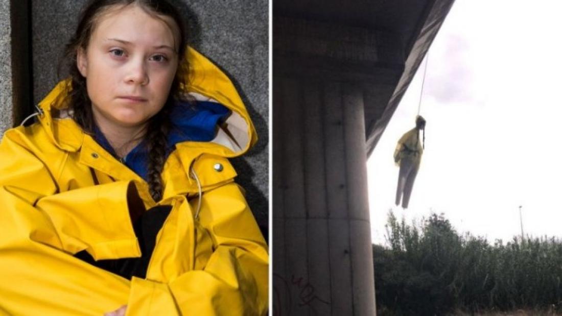 Πάνω στην κούκλα ήταν καρφιτσωμένη η επιγραφή «Η Γκρέτα είναι ο Θεός σας» στα αγγλικά (Greta is your God). Αμέσως έσπευσαν στην περιοχή οχήματα της πυροσβεστικής και της αστυνομίας, και κατέβασαν το ομοίωμα της Γκρέτα.