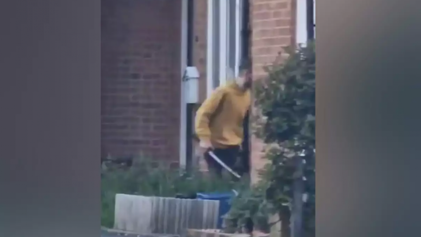 Σε βίντεο που ανέβηκαν στο Twitter φαίνεται ο άνδρας να κυκλοφορεί με το σπαθί από σπίτι σε σπίτι και γύρω του να υπάρχουν ασθενοφόρα και δυνάμεις της αστυνομίας.