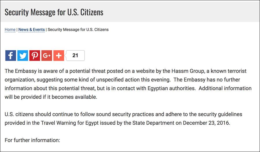 Η πρεσβεία των στο Κάιρο είχε προειδοποιήσει τη νύχτα της 24ης Μαΐου για επικείμενη, αλλά απροσδιόριστη τρομοκρατική επίθεση.