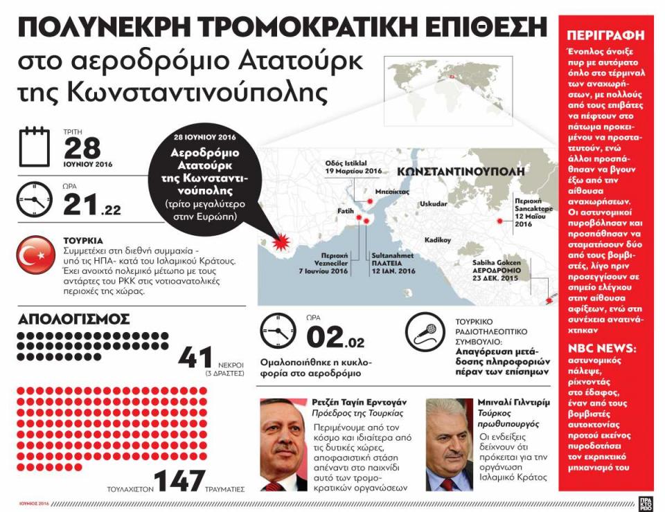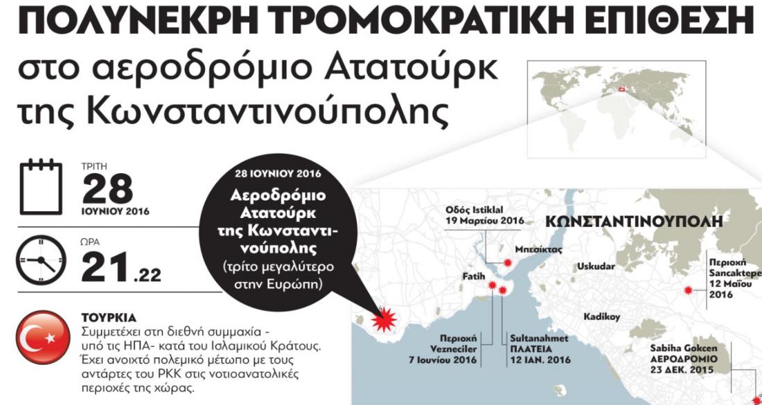 Τρεις βομβιστές αυτοκτονίας άνοιξαν πυρ και ανατινάχτηκαν στο διεθνές αεροδρόμιο της Κωνσταντινούπολης, με συνέπεια το θάνατο 36 ανθρώπων και τον τραυματισμό τουλάχιστον 150. Σύμφωνα με τον Τούρκο πρωθυπουργό, η επίθεση αποδίδεται στο Ισλαμικό Κράτος.