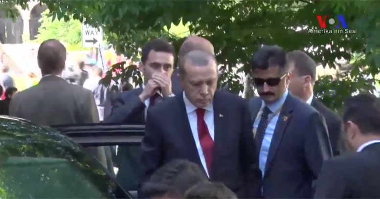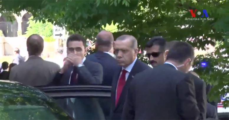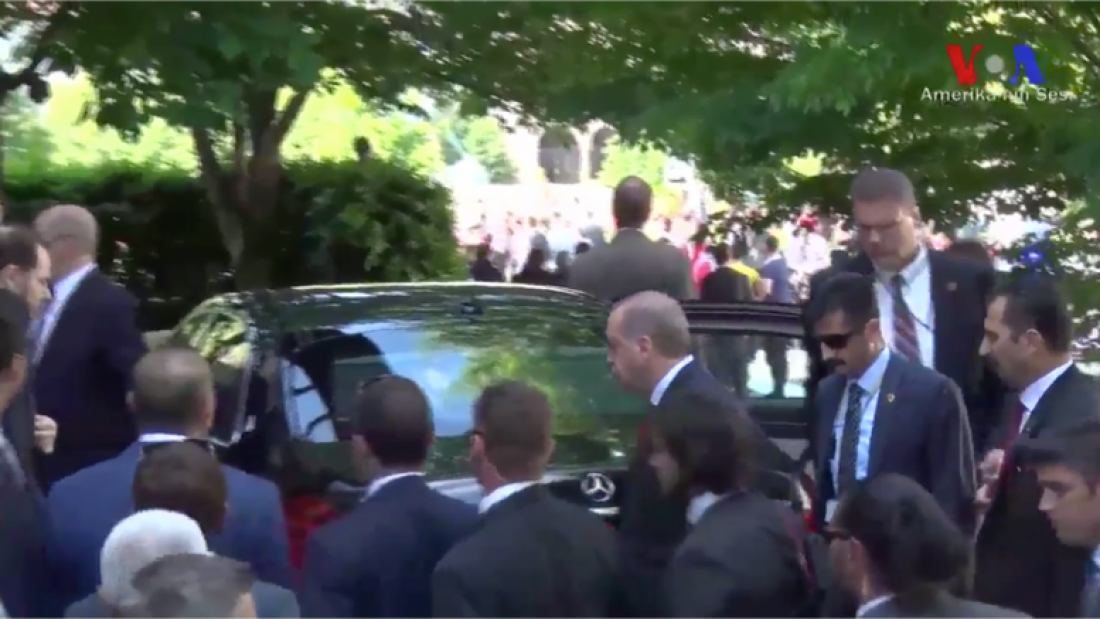 Το αποκαλυπτικό βίντεο της «Φωνής της Αμερικής», δείχνει τις στιγμές λίγα λεπτά πριν ξεκινήσουν τα βίαια επεισόδια εναντίον των Κούρδων. Ένας φρουρός του, που σύμφωνα με Τούρκους συναδέλφους είναι ο αρχηγός των μπάτσων, συνομιλεί με τον Ερντογάν, που έχει φτάσει έξω από την πρεσβευτική κατοικία και περιμένει μέσα στην λιμουζίνα του. Η πόρτα του αυτοκινήτου είναι ανοικτή.
