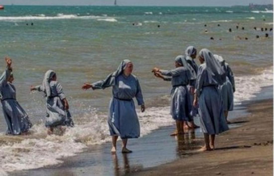 Εν μέσω της αντιπαράθεσης που έχει ξεσπάσει στη Γαλλία για το μπουρκίνι, ο Ιζεντίν Εζίρ, ένας ιμάμης από τη Φλωρεντία, δημοσιοποίησε –χωρίς να προβεί σε κανένα σχόλιο– μια φωτογραφία στην οποία οι καλόγριες, ντυμένες από την κορφή μέχρι τα νύχια, παίζουν με τα κύματα στην παραλία.