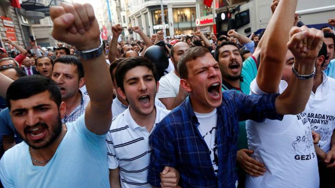 Οι διαδηλωτές, που συγκεντρώθηκαν νωρίτερα φώναζαν συνθήματα όπως: "όλοι μαζί ενάντια στον φασισμό", αποκαλώντας τον Τούρκο πρόεδρο Ρετζέπ Ταγίπ Ερντογάν "κλέφτη" και "δολοφόνο".