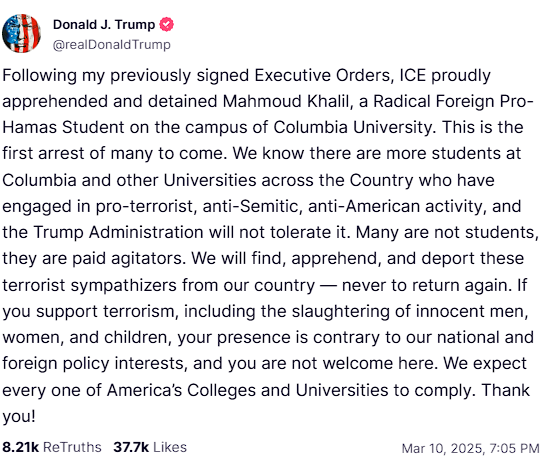 «Γνωρίζουμε ότι υπάρχουν και άλλοι φοιτητές στο Columbia και σε άλλα πανεπιστήμια που συμμετείχαν σε φιλοτρομοκρατικές, αντισημιτικές, αντιαμερικανικές δραστηριότητες και η κυβέρνηση Τραμπ δεν θα το ανεχθεί. Πολλοί δεν είναι φοιτητές, είναι πληρωμένοι ταραξίες. Θα βρούμε, θα συλλάβουμε και θα απελάσουμε αυτούς τους υποστηρικτές τρομοκρατών από τη χώρα μας, να μην επιστρέψουν ποτέ», έγραψε ο Αμερικανός πρόεδρος στο δίκτυό του Truth Social, προσθέτοντας: «Αναμένουμε όλα τα αμερικανικά πανεπιστήμια να τηρήσουν τους κανόνες».