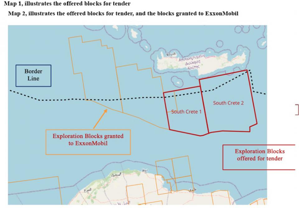 • Δύο από τις ανακοινωθείσες περιοχές, Κρήτη 1 και Κρήτη 2, βρίσκονται γεωγραφικά εντός των λιβυκών θαλάσσιων περιοχών (επί των οποίων οι δύο χώρες διατηρούν διαφορετικές διεκδικήσεις). Η συνολική έκταση των δύο περιοχών είναι 23.300 km² και πάνω από το 85% αυτής της έκτασης βρίσκεται νότια της γραμμής οριοθέτησης που χωρίζει τη Λιβύη από τη γειτονική της, την Ελλάδα.