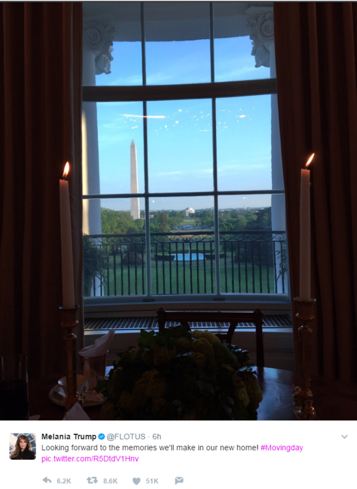 "Ανυπομονώ για τις αναμνήσεις που θα αποκτήσουμε στο νέο μας σπίτι #ΗμέραΜετακόμισης" , έγραψε χθες το απόγευμα στο Twitter η μετά την άφιξή της με τον Μπάρον στον Λευκό Οίκο. Το tweet συνόδευε μια φωτογραφία του Μνημείου Ουάσινγκτον όπως από φαίνεται από το Κόκκινο Δωμάτιο του Λευκού Οίκου.