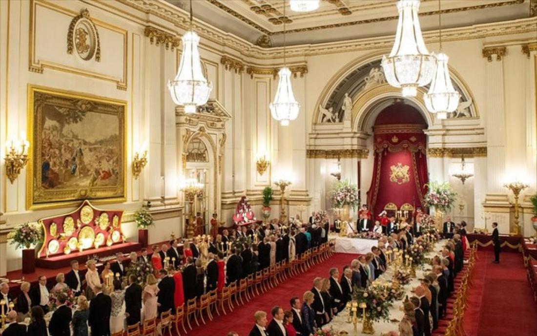 Τέσσερα πιάτα, πάνω από 2.000 ασημένια μαχαιροπήρουνα και… τήρηση του πρωτοκόλλου περιλάμβανε το επίσημο δείπνο που παρέθεσε η βασίλισσα Ελισάβετ στον Αμερικανό πρόεδρο Ντόναλντ Τραμπ, στο Μπάκιγχαμ.