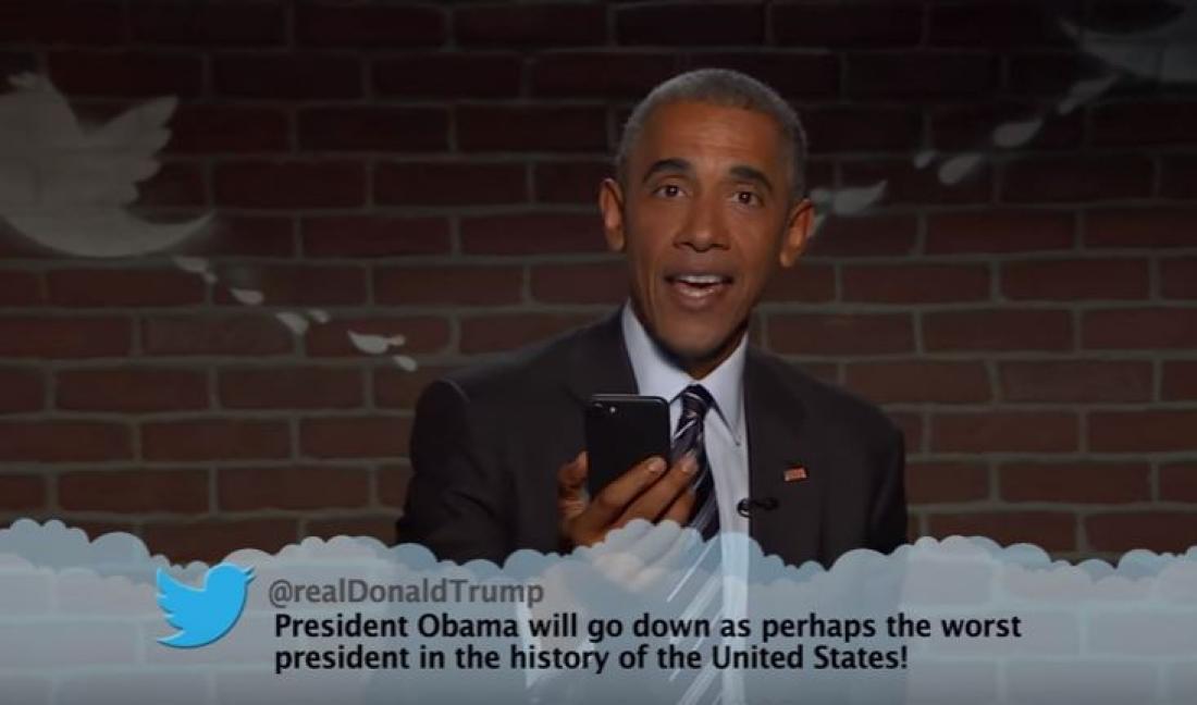 Έτσι, ο Αμερικανός πρόεδρος δε δίστασε να διαβάσει μία σειρά από αναρτήσεις με ειδικό νόημα, που έχει κάνει ο Τραμπ στο Twitter, κατά τη χθεσινοβραδινή εκπομπή "Jimmy Kimmel Live," στο τηλεοπτικό δίκτυο ABC.