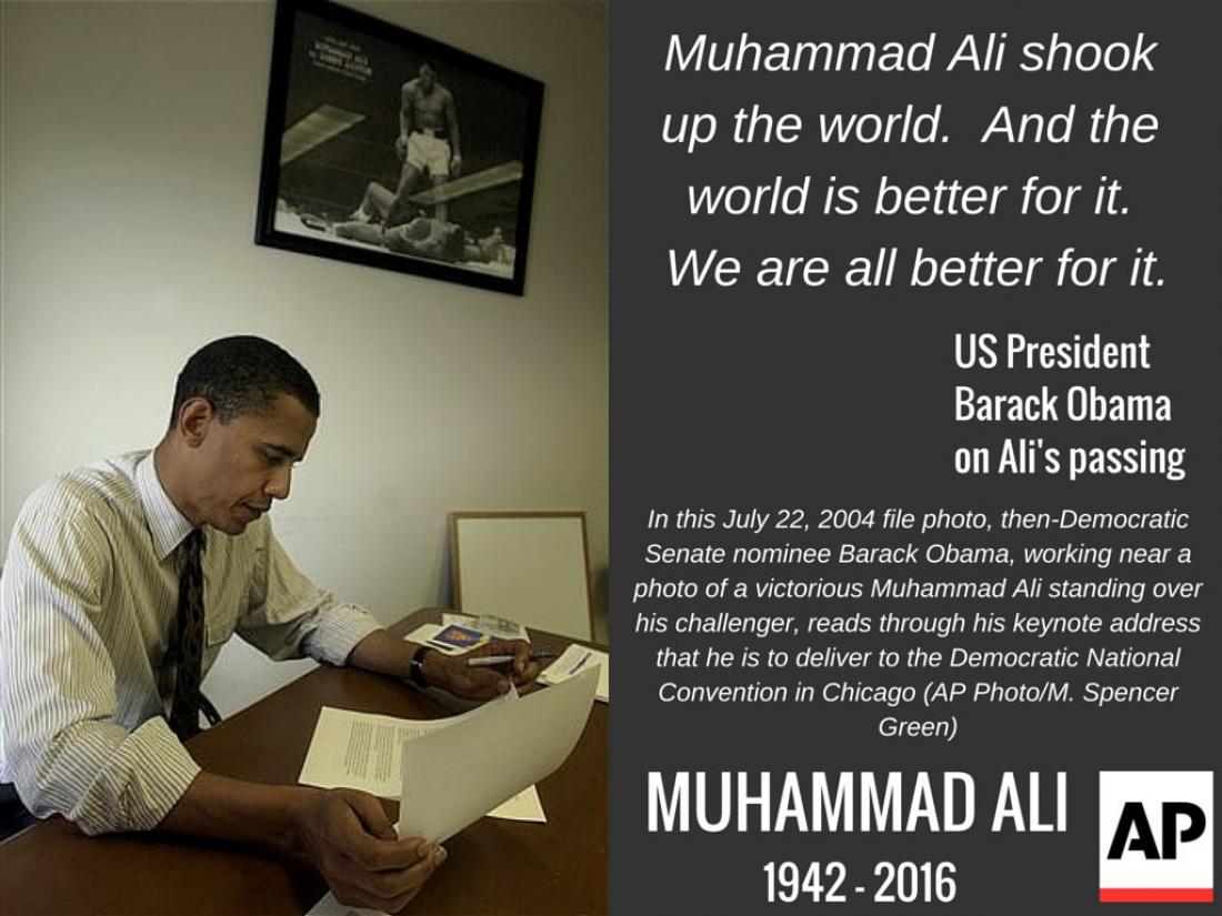 Ο Μπαράκ Ομπάμα, ο οποίος έχει ένα ζευγάρι γάντια του Άλι στο προσωπικό του γραφείο, σημείωσε ότι για εκείνον ο πυγμάχος ήταν «ένας άνδρας που πάλεψε για εμάς. Στάθηκε στο ύψος των (Μάρτιν Λούθερ) Κινγκ και (Νέλσον) Μαντέλα. Αντιστάθηκε στα δύσκολα. Μίλησε άφοβα όταν κανείς άλλος δεν μπορούσε» να το κάνει.
