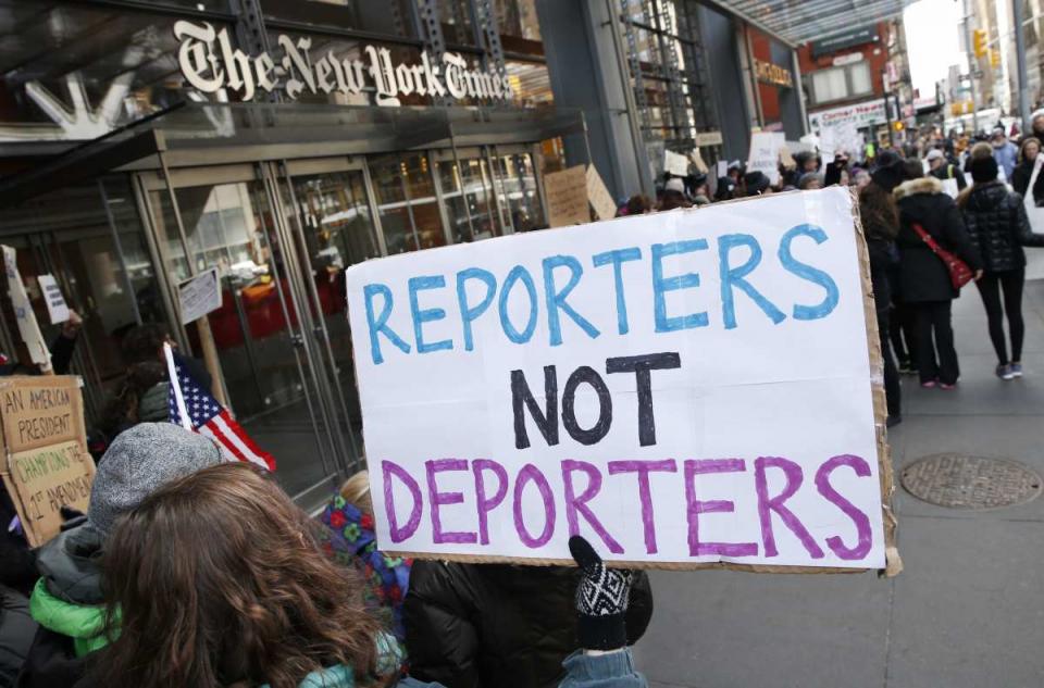 Χθες, ο Λευκός Οίκος απαγόρευσε στα μέσα αυτά την πρόσβαση στο καθημερινό μπρίφινγκ του εκπροσώπου του Τραμπ. Οι διαδηλωτές συγκεντρώθηκαν μπροστά στην είσοδο του κτιρίου των New York Times , κοντά στην Τάιμς Σκουέρ, κρατώντας πλακάτ με την πρώτη τροπολογία του αμερικανικού Συντάγματος για την ελευθερία του Τύπου. Ορισμένοι φορούσαν στο στόμα ταινία για να συμβολίσουν την απόπειρα φιμώματος των μέσων ενημέρωσης.