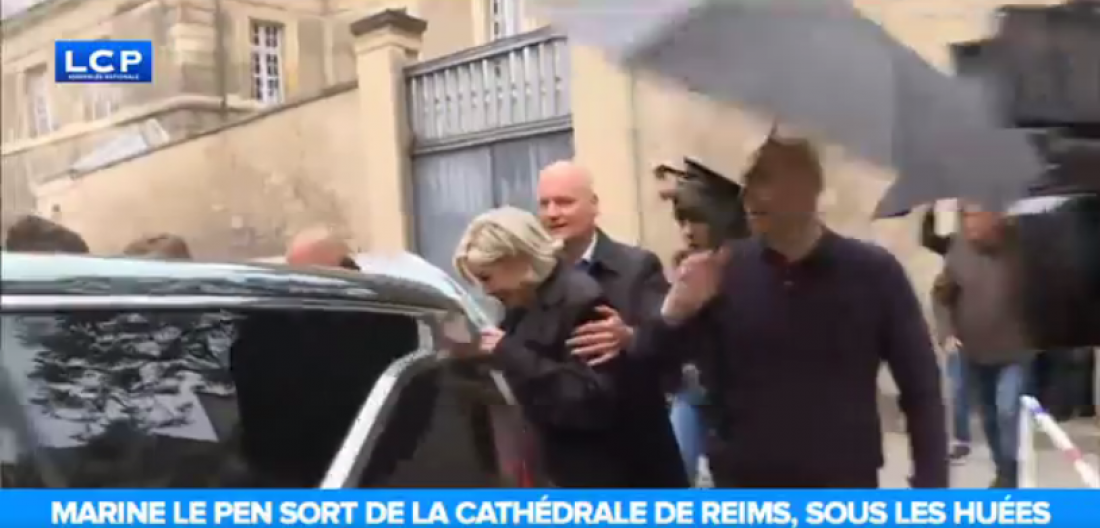 Η Λεπέν έγινε δεκτή από διαδηλωτές που φώναζαν «Μαρίν γύρνα πίσω τα χρήματα!», ενώ όταν εξήλθαν του ναού από μια κρυφή πόρτα, οι συγκεντρωμένοι τους αποδοκίμασαν και εκσφενδόνισαν εναντίον τους αντικείμενα.