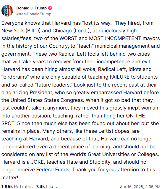 «Ίσως το Χάρβαρντ να πρέπει να χάσει το καθεστώς της φορολογικής εξαίρεσης και να φορολογηθεί ως πολιτική οντότητα, εάν συνεχίσει να υπερασπίζεται την πολιτική, ιδεολογική και εμπνευσμένη από/ή που υποστηρίζει την τρομοκρατία "τρέλα" του», έγραψε ο Αμερικανός πρόεδρος στο μέσο του κοινωνικής δικτύωσης Truth Social.