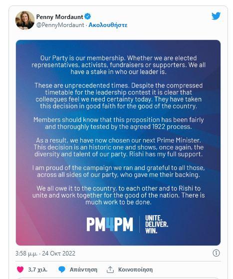 Νέος ηγέτης του Συντηρητικού Ενωτικού Κόμματος και άρα νέος πρωθυπουργός του Ηνωμένου Βασιλείου θα είναι ο Ρίσι Σούνακ, καθώς η Πένι Μόρντοντ, αποχώρησε από την κούρσα της διαδοχής της Λιζ Τρας.