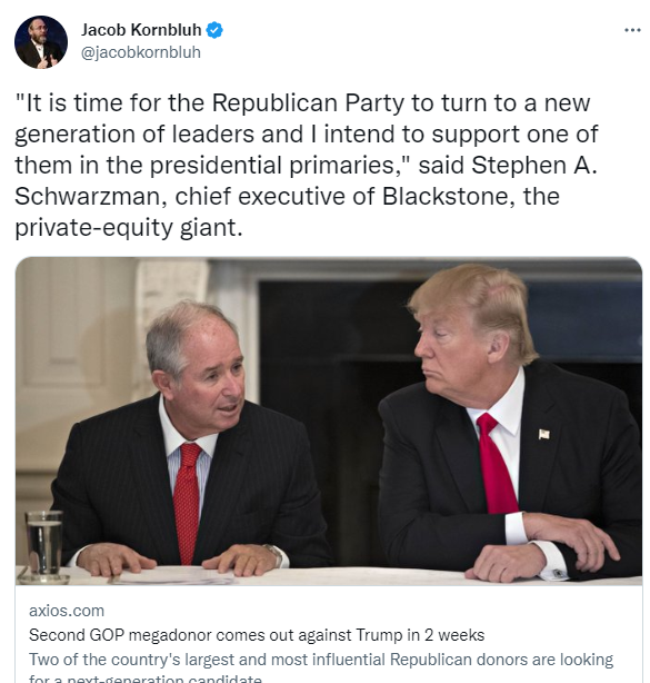 Όπως μετέδωσε το Reuters, ο Στίβεν Σβάρτσμαν, ιδρυτής και διευθύνων σύμβουλος της επενδυτικής Blackstone, δεν θα στηρίξει τον Τραμπ, προτρέποντας τους Ρεπουμπλικανούς να επιλέξουν ένα πρόσωπο της «νέας γενιάς», με πολλούς να εικάζουν ότι αναφέρεται στον Ρον Ντε Σάντις, τον νεαρό κυβερνήτη της Φλόριντα.