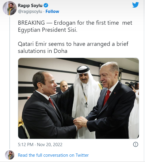 Για πρώτη φορά συναντήθηκαν ο πρόεδρος της Τουρκίας Ρετζέπ Ταγίπ Ερντογάν με τον Αιγύπτιο ομόλογό του Αμπντέλ Φατάχ αλ Σίσι στη Ντόχα του Κατάρ. Εκεί βρίσκονται και οι δύο στο πλαίσιο της έναρξης του Παγκοσμίου Κυπέλλου. Πρόκειται για μία ιστορική «κυβίστηση» από τον πρόεδρο της Τουρκίας.