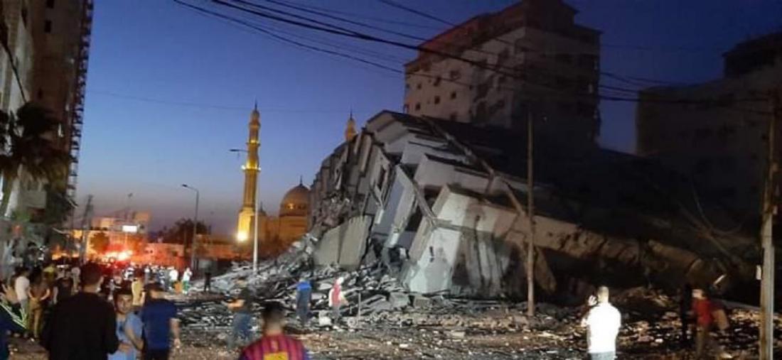 A huge, 10-floor tower in central city has been levelled to the ground by Israeli F16 missiles. al-Jawhara tower includes tens of offices for media/journalistic institutions.