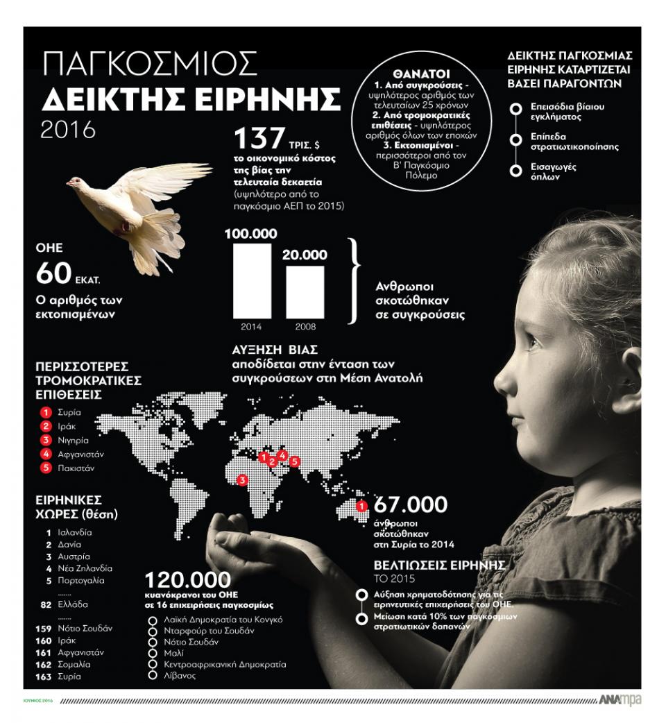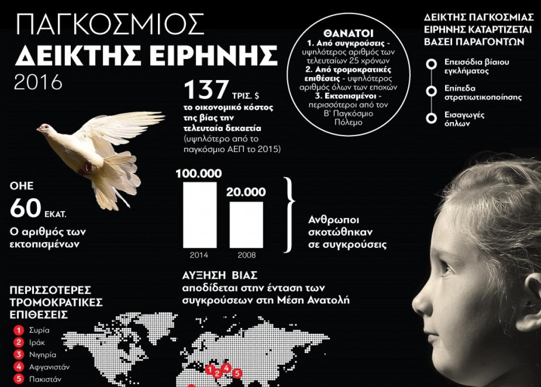 Η βία έχει αυξηθεί στον κόσμο, με τους θανάτους από τις συγκρούσεις να έχουν φτάσει τον υψηλότερο αριθμό των τελευταίων 25 χρόνων, τις τρομοκρατικές επιθέσεις τον υψηλότερο αριθμό όλων των εποχών και τους εκτοπισμένους να είναι περισσότεροι από ποτέ μετά τον Β' Παγκόσμιο Πόλεμο, δείχνει ο Παγκόσμιος Δείκτης Ειρήνης 2016.