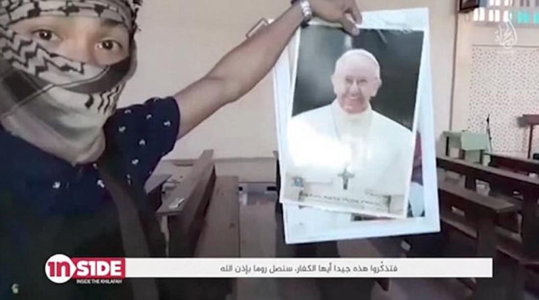 Στο βίντεο, ένας τζιχαντιστής δείχνει την φωτογραφία του πάπα Φραγκίσκου και ακούγεται να λέει ότι «πρόκειται να (φτάσουμε) ως τη Ρώμη».