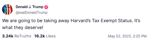 Ο Τραμπ είχε ζητήσει προηγουμένως να χάσει το Χάρβαρντ το καθεστώς φοροαπαλλαγής του, αφού το πανεπιστήμιο δήλωσε ότι δεν θα συμμορφωθεί με μια σειρά από απαιτήσεις της κυβέρνησης, συμπεριλαμβανομένων δράσεων σχετικά με τον αντισημιτισμό.