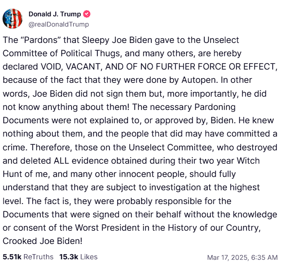 Σε ανάρτησή του στα social media ο πρόεδρος των ΗΠΑ ισχυρίζεται ότι οι απονομές χάριτος είναι άκυρες, καθώς υπογράφηκαν από Autopen (αυτόματο μηχάνημα υπογραφής), αναφορά που βασίζεται σε αμερικανικά δημοσιεύματα.