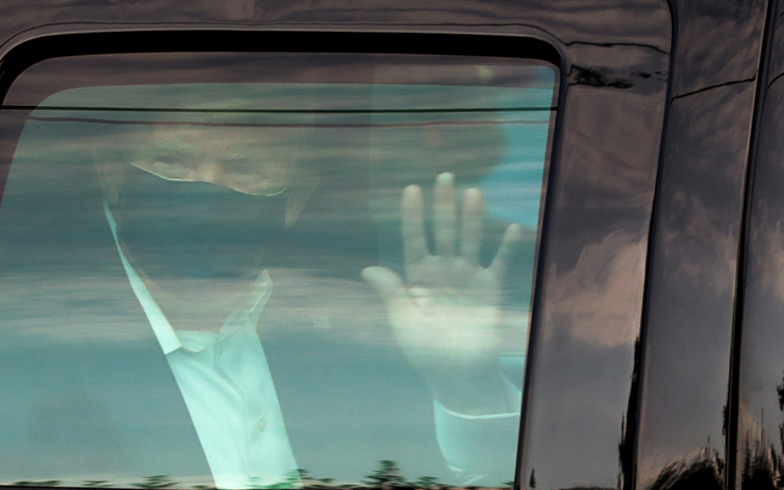 Προς γενική έκπληξη, μια οχηματοπομπή αποτελούμενη από μαύρα SUV εμφανίστηκε μπροστά στις πύλες του νοσοκομείου Ουόλτερ Ριντ νωρίς το βράδυ, κι ο Ντόναλντ Τραμπ, με μάσκα, χαιρέτισε μέσα από το κλειστό παράθυρο του αυτοκινήτου της προεδρίας πολυάριθμους υποστηρικτές του, που είχαν εγκατασταθεί στον χώρο έξω από το νοσοκομείο το Σαββατοκύριακο.