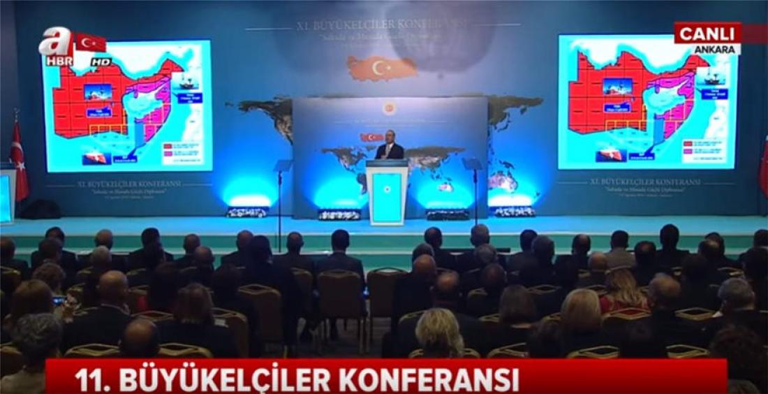 Ο Τούρκος υπουργός Εξωτερικών κατά τη διάρκεια ομιλίας του στην Άγκυρα παρουσίασε χάρτη με την υφαλοκρηπίδα της Τουρκίας που φτάνει μέχρι την Κρήτη!