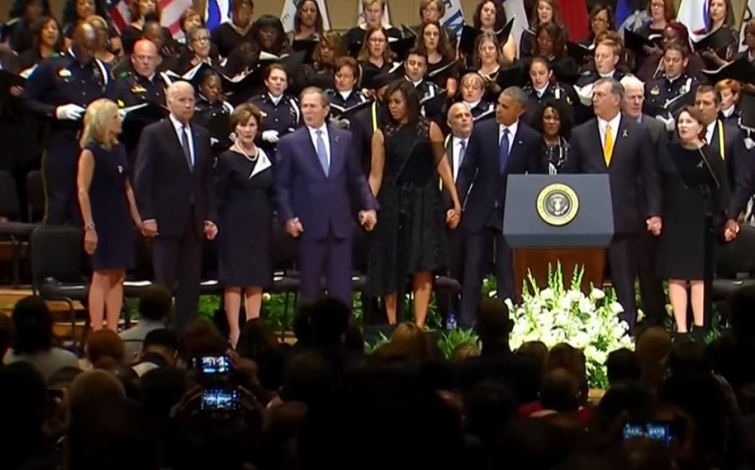 Στην επιμνημόσυνο τελετή για τα θύματα του μακελειού του Ντάλας έδωσε το παρόν ο Τζορτζ Μπούς με τη σύζυγό του.