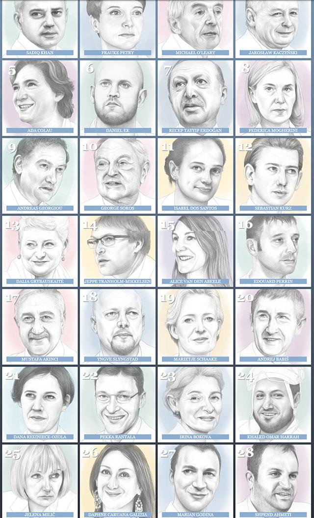 Η ευρωπαϊκή εκδοχή του Politico έδωσε στη δημοσιότητα τους 28 ανθρώπους που αυτή τη στιγμή καθορίζουν, αλλάζουν ή και επηρεάζουν με τη στάση τους τα δεδομένα στην Ευρώπη, μέσα από τη δουλειά και τη στάση ζωής τους γενικότερα.